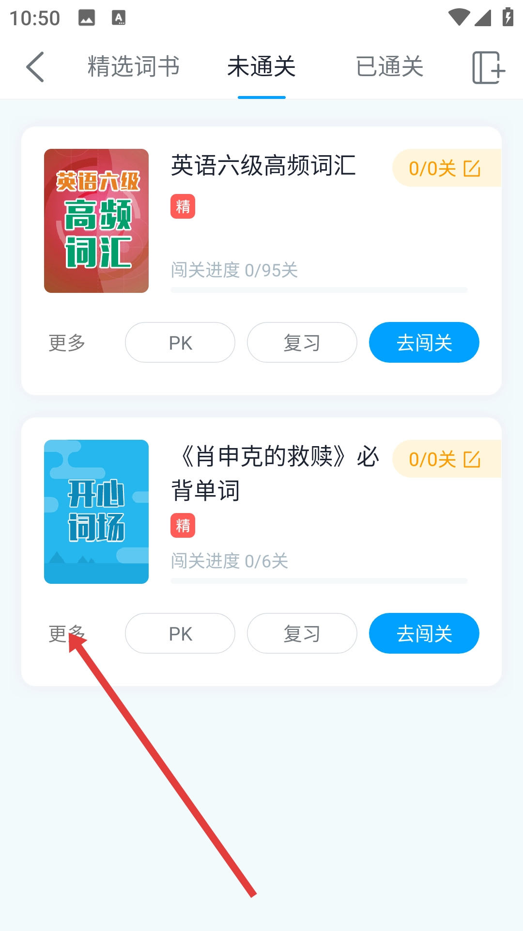 3、在未通关页面中,点击《肖申克的救赎》必背单词板块下方的【更多】按钮。