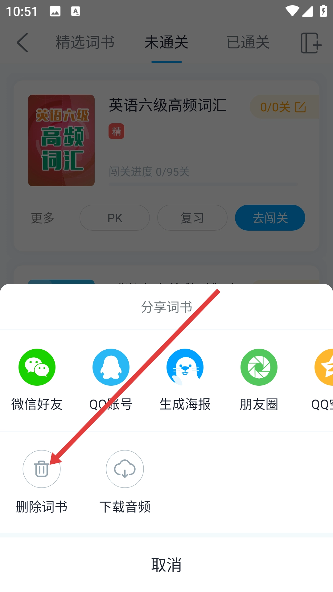 4、在弹出的操作选项里,点击【删除词书】就能移除该词书,回到主页就能看到重置后的单词书了。