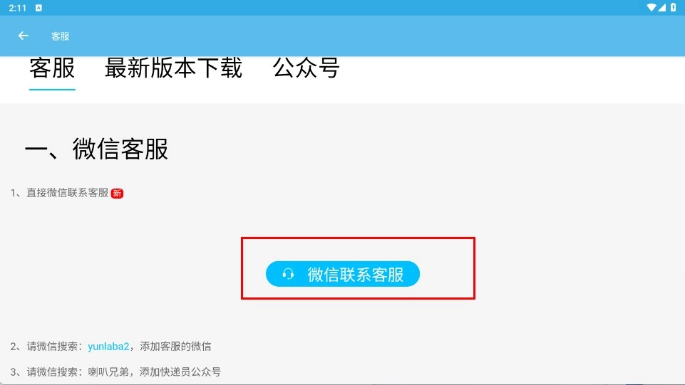 3、进入客服页面后,点击【微信联系客服】按钮,既能直接通过微信联系客服,也可依据提示搜索并添加客服微信或公众号。