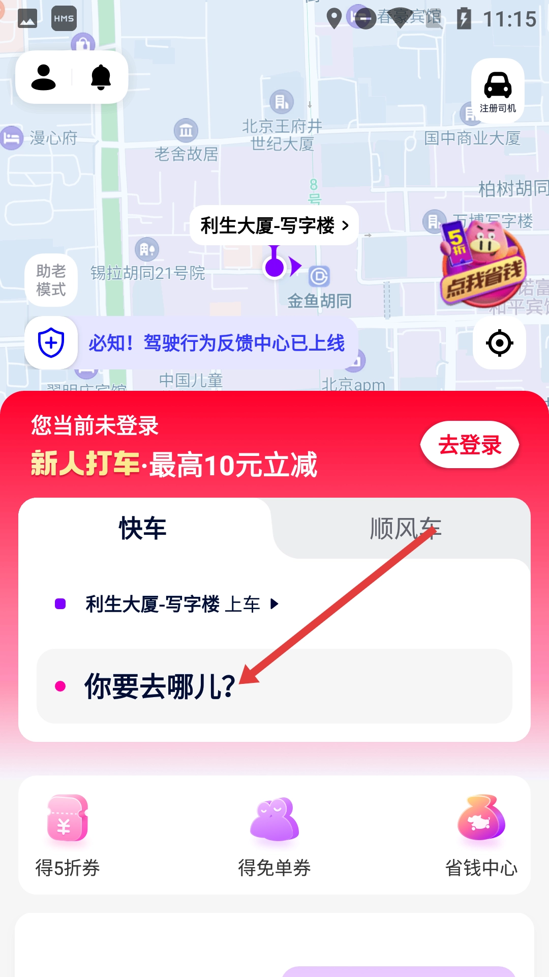 1、在打车应用的首页,找到并点击【你要去哪儿?】这个输入框,即可进入目的地选择页面。