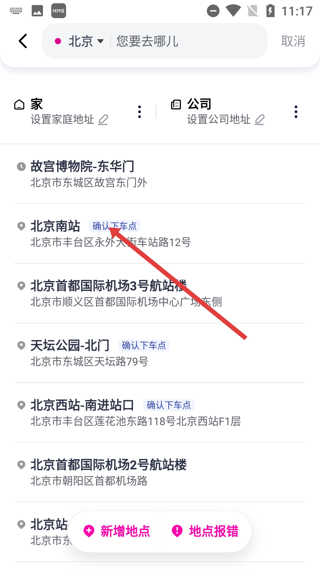 2、进入目的地选择页面后,把【北京南站】选定为目的地。