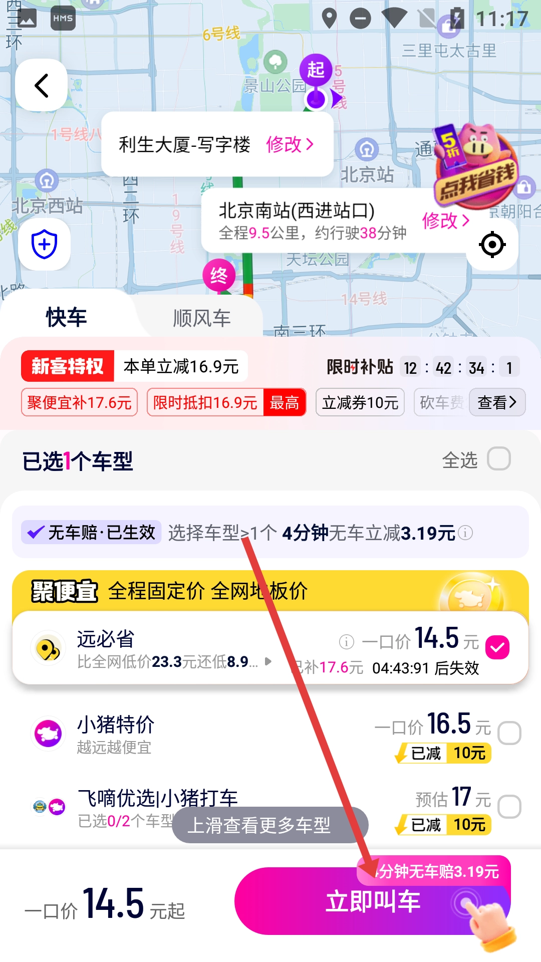 在车型选择页面,挑选好合适的车型后,点击【立即叫车】按钮就能发起打车请求。