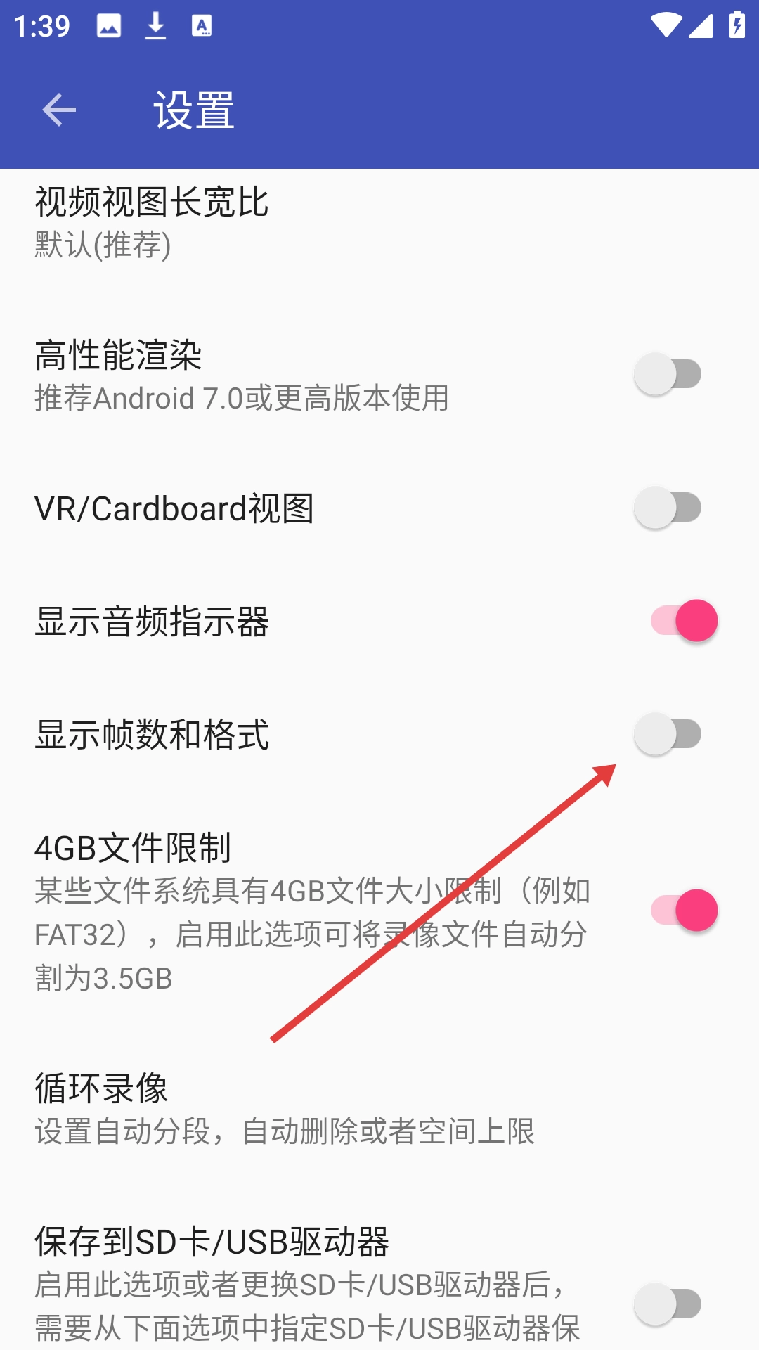 3、进入设置页面后,找到【显示帧数和格式】这一选项,接着点击该选项右侧的开关按钮。