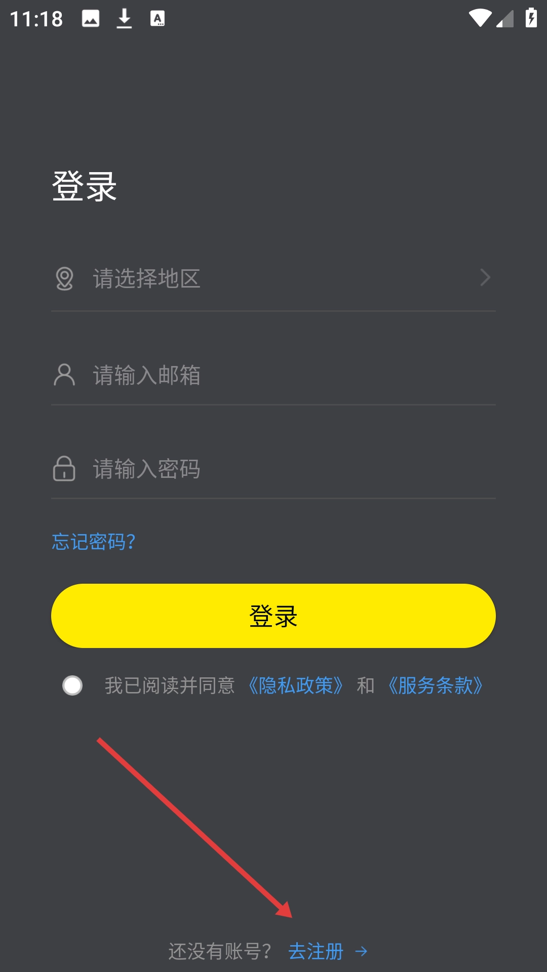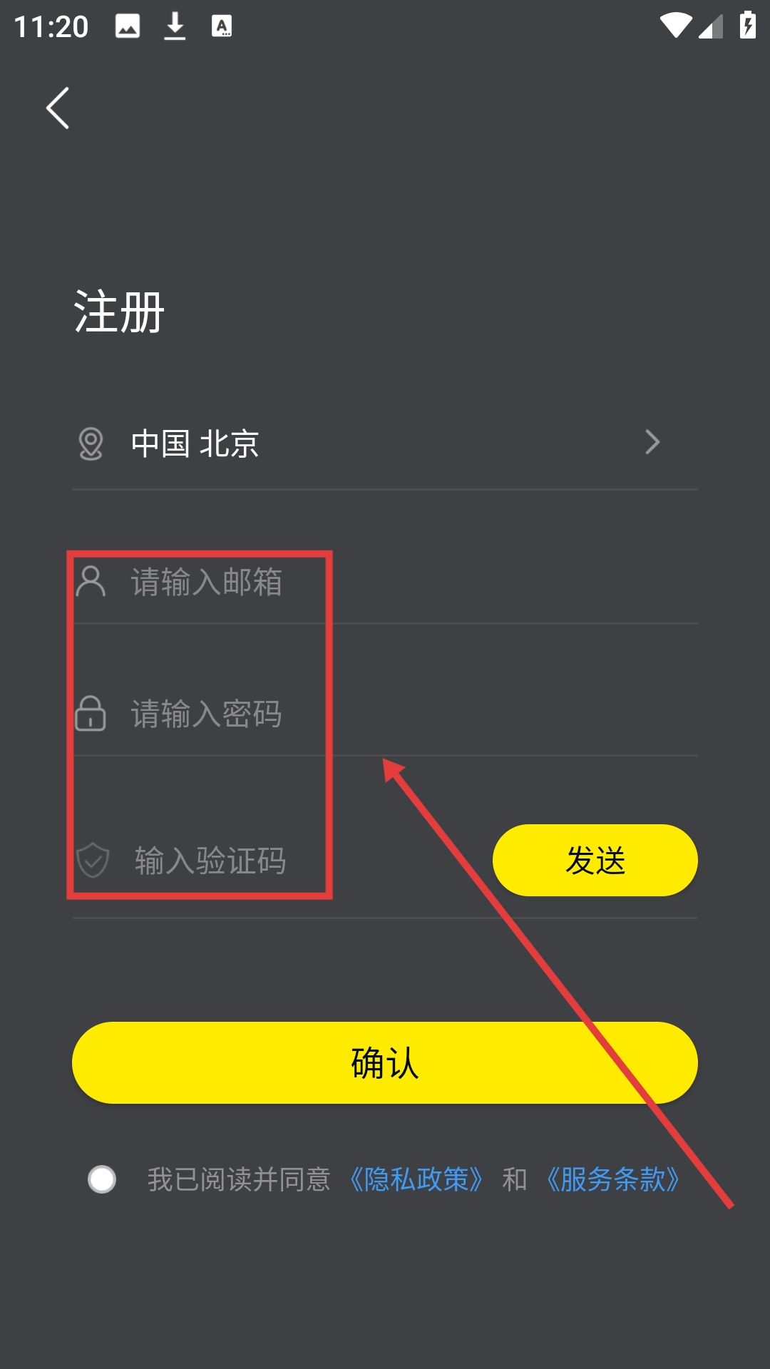 3、在注册页面输入邮箱、密码,获取并输入验证码。