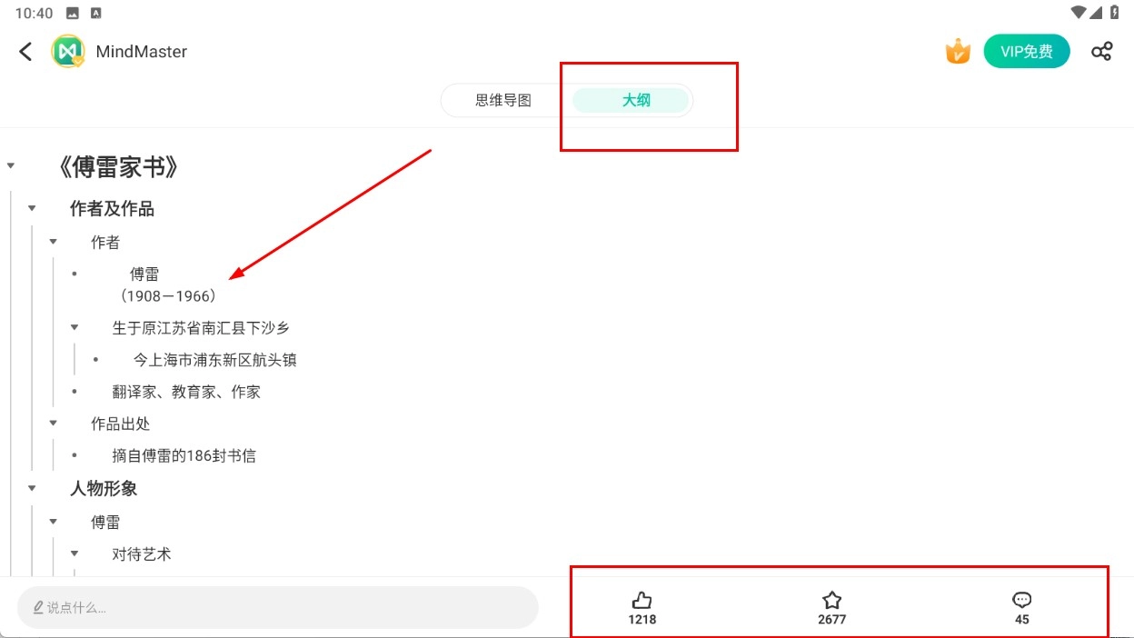 4、切换至【大纲-视图模式】,既能够查看以文字形式呈现的内容结构,也可以开展点赞、收藏、评论等操作。