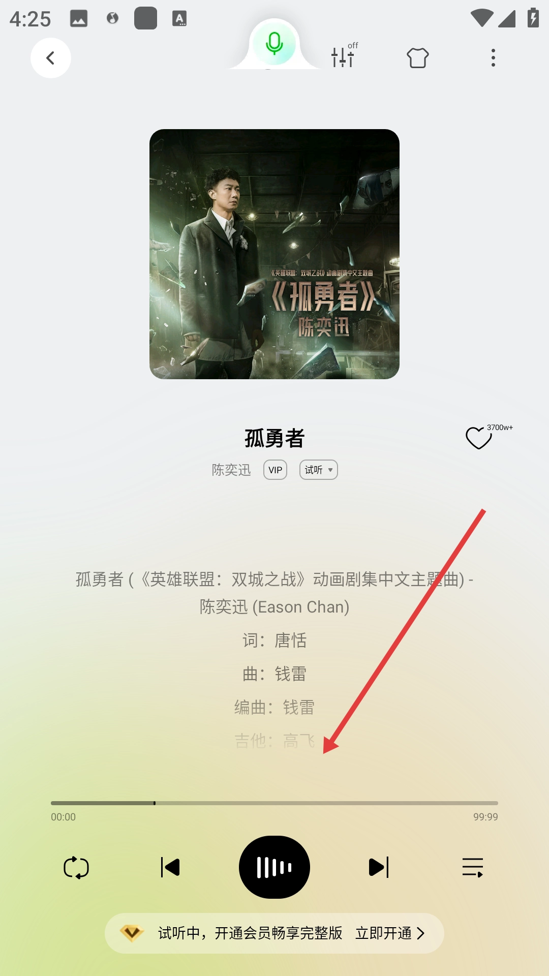 4、进入歌曲播放页面后,即可开始播放《孤勇者》。