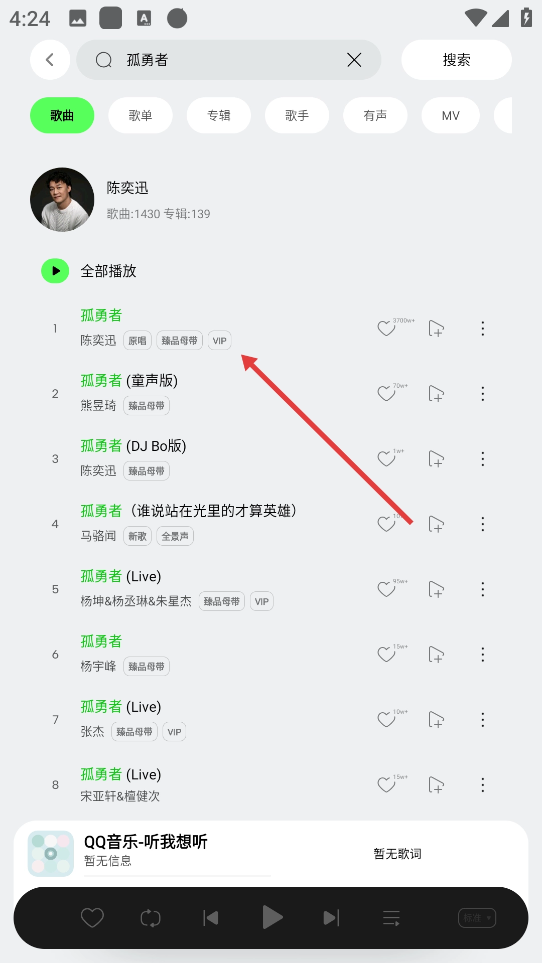 3、在搜索结果页面点击由陈奕迅演唱的歌曲《孤勇者》。