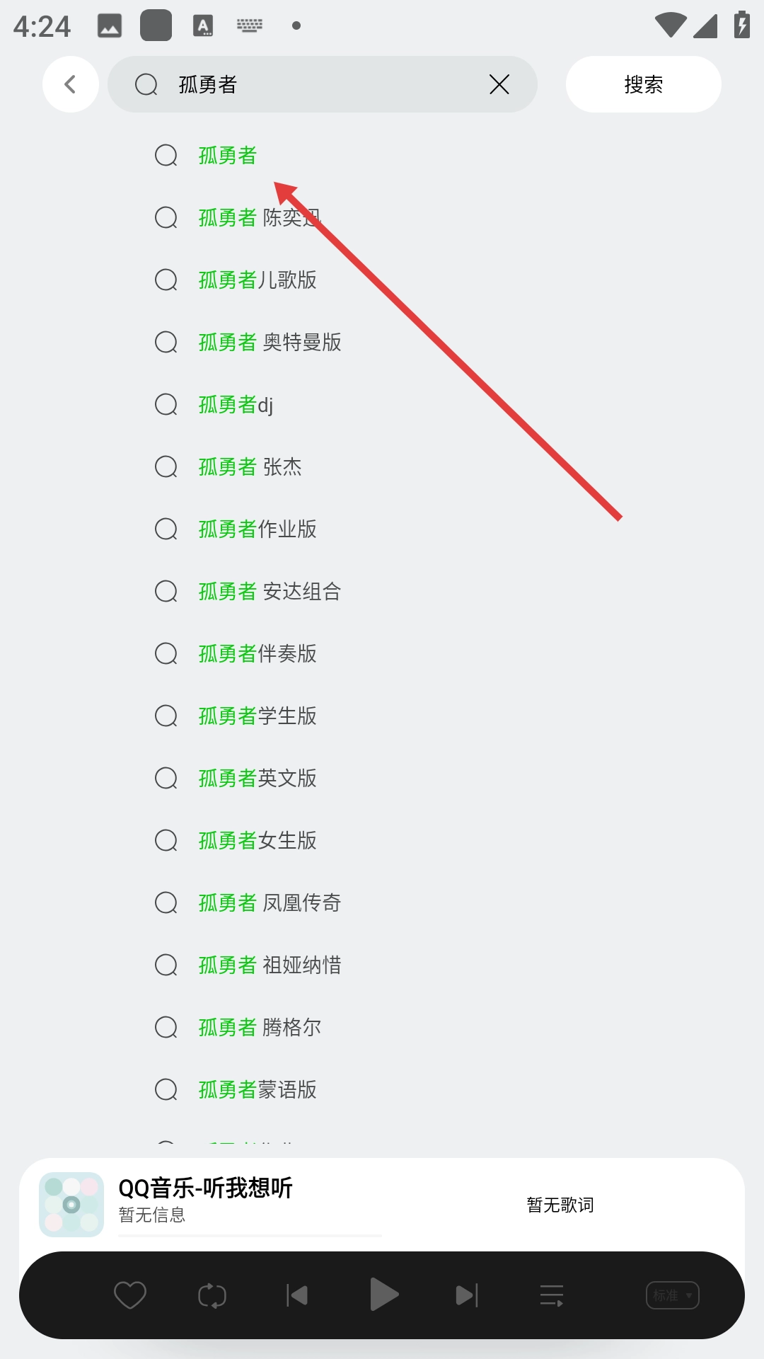2、在搜索页面输入“孤勇者”,然后从搜索建议里选择【孤勇者】这一项。