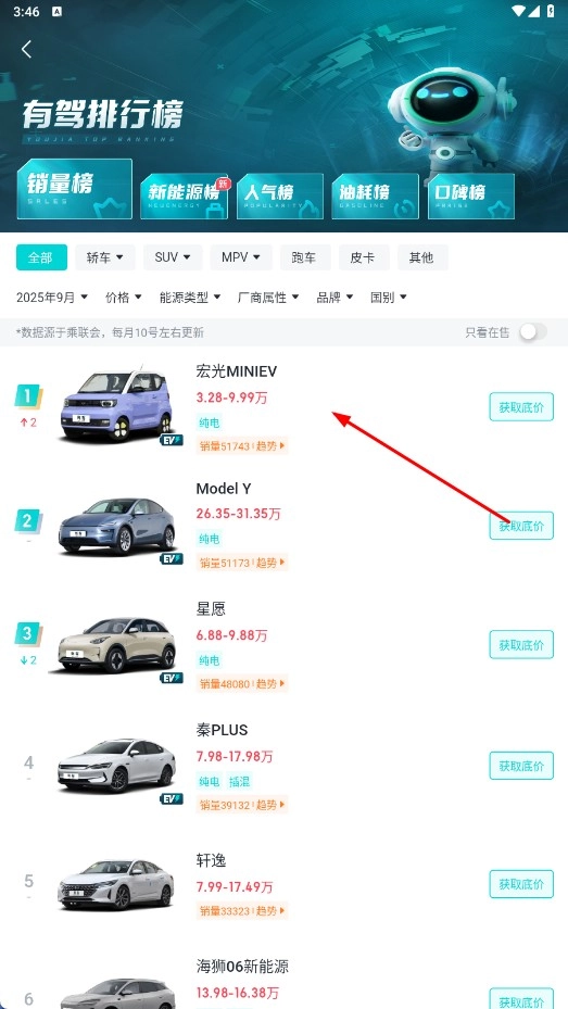3、在销量排行页面,选择你感兴趣的车型,比如点击【宏光MINIEV-车型条目】,即可进入该车型的详情页面。