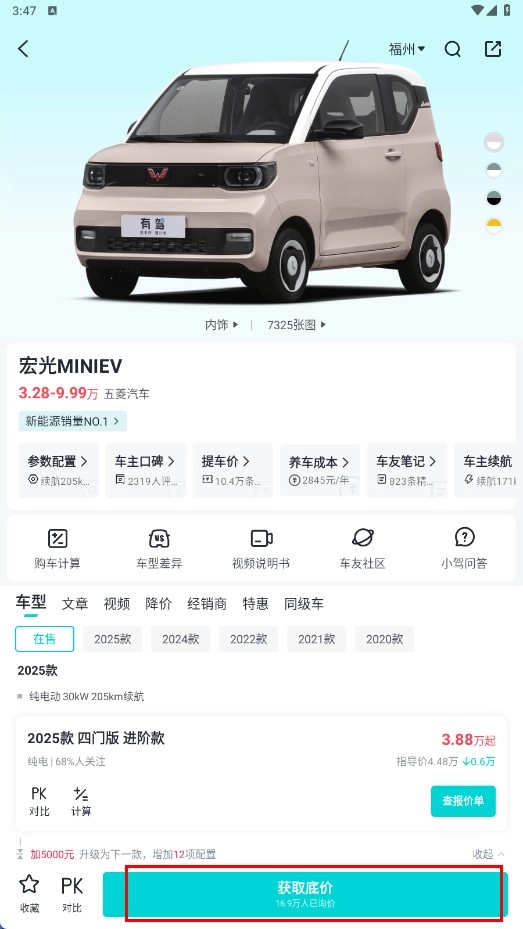 4、在车型详情页面,点击【获取底价】功能按钮,即可了解该车型的底价信息。