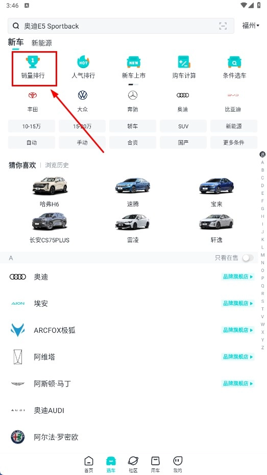 2、在页面中点击【销量排行】功能按钮,即可查看汽车销量排行情况。
