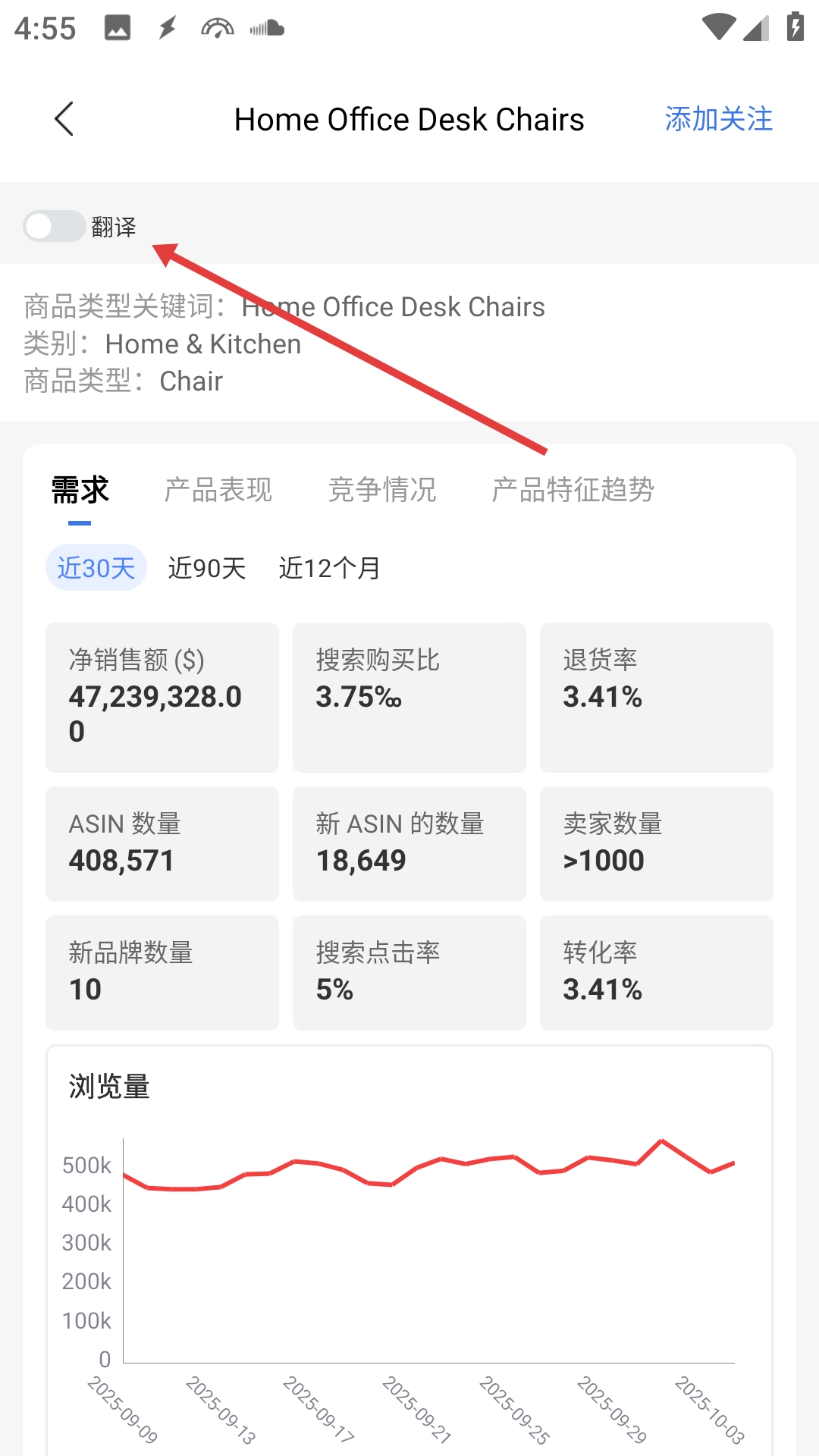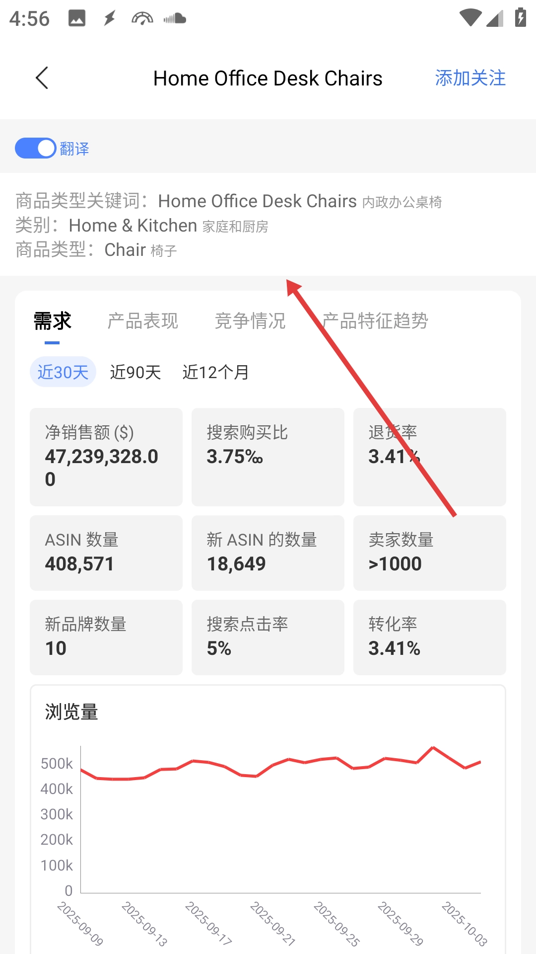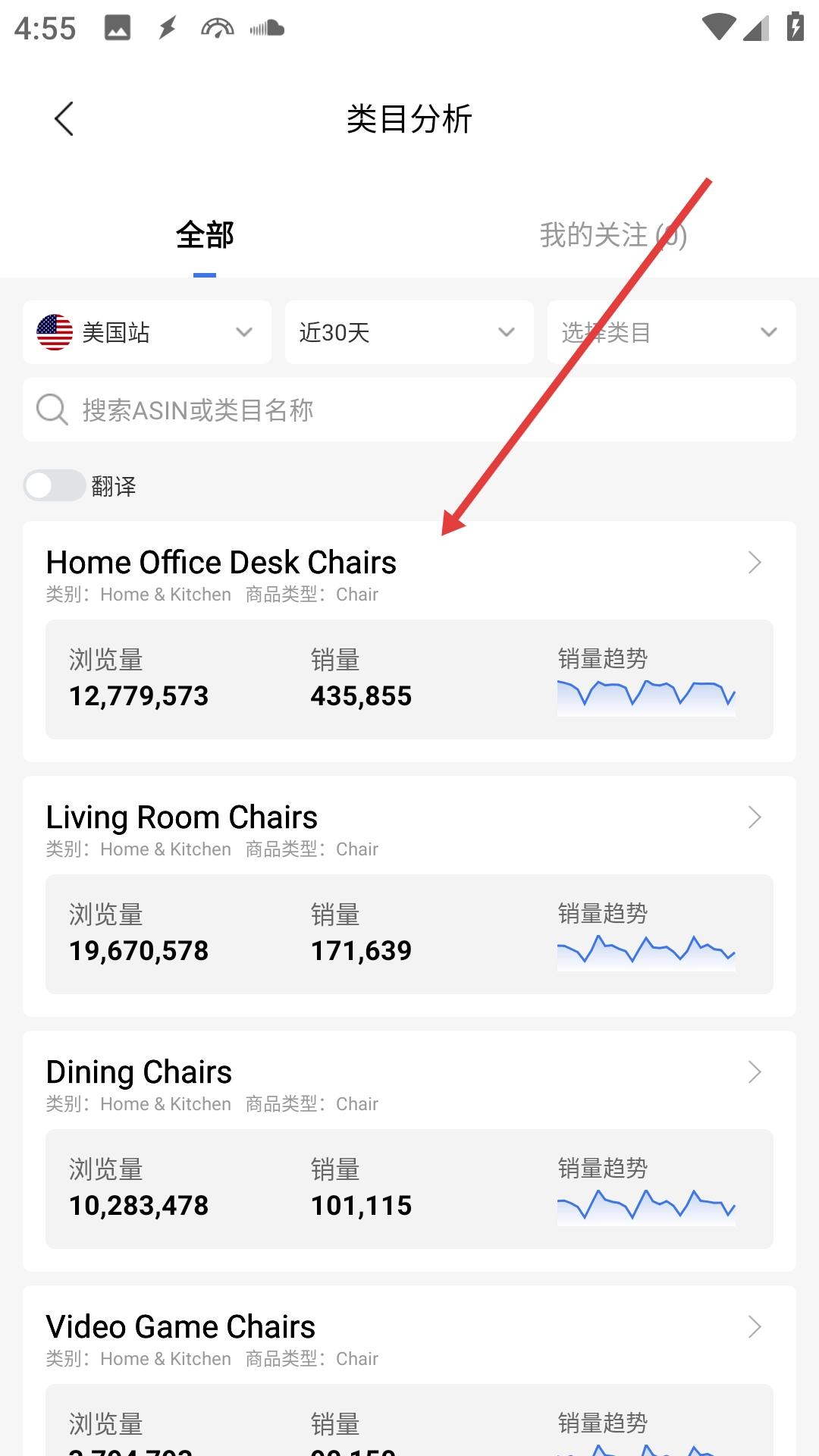 2、在类目分析页面挑选你感兴趣的类目,例如【Home-Office-Desk-Chairs】,随后进入该类目对应的详情页面。