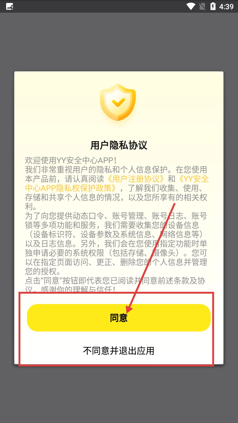 在使用YY安全中心之前,您需要阅读《用户注册协议》,只有点击【同意】按钮后,才能使用该服务。