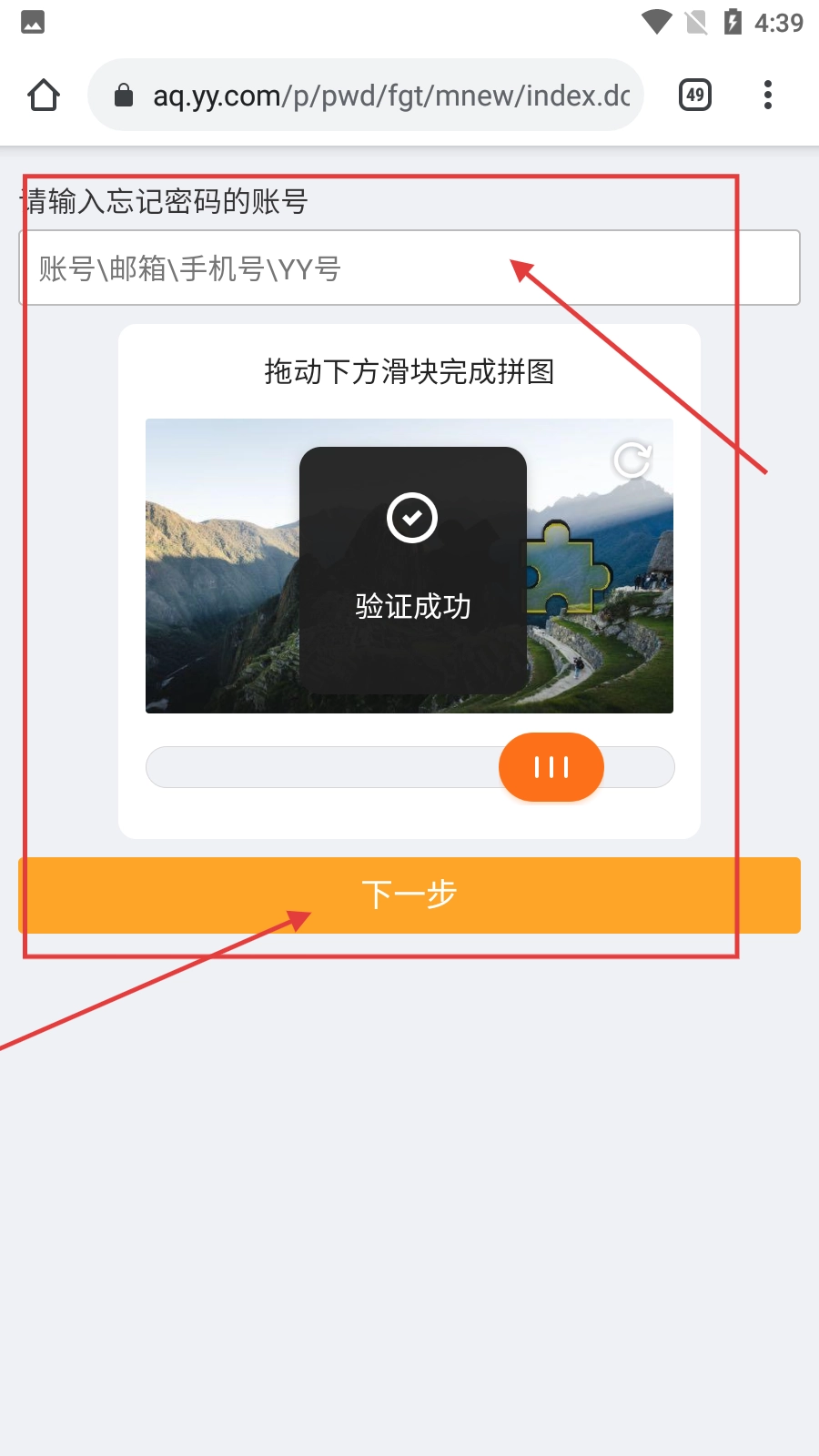3、进入密码找回页面后,先输入账号,完成拼图验证,然后点击【下一步】按钮,即可继续进行密码找回的后续操作。