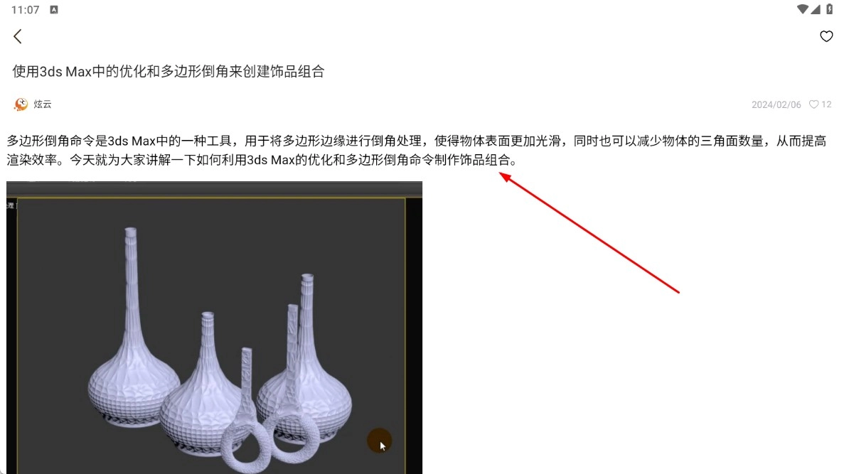 4、进入文章详情页后,能够浏览《使用3dsMax中的优化和多边形倒角来创建饰品组合》的文章内容,从而学习相关技术。