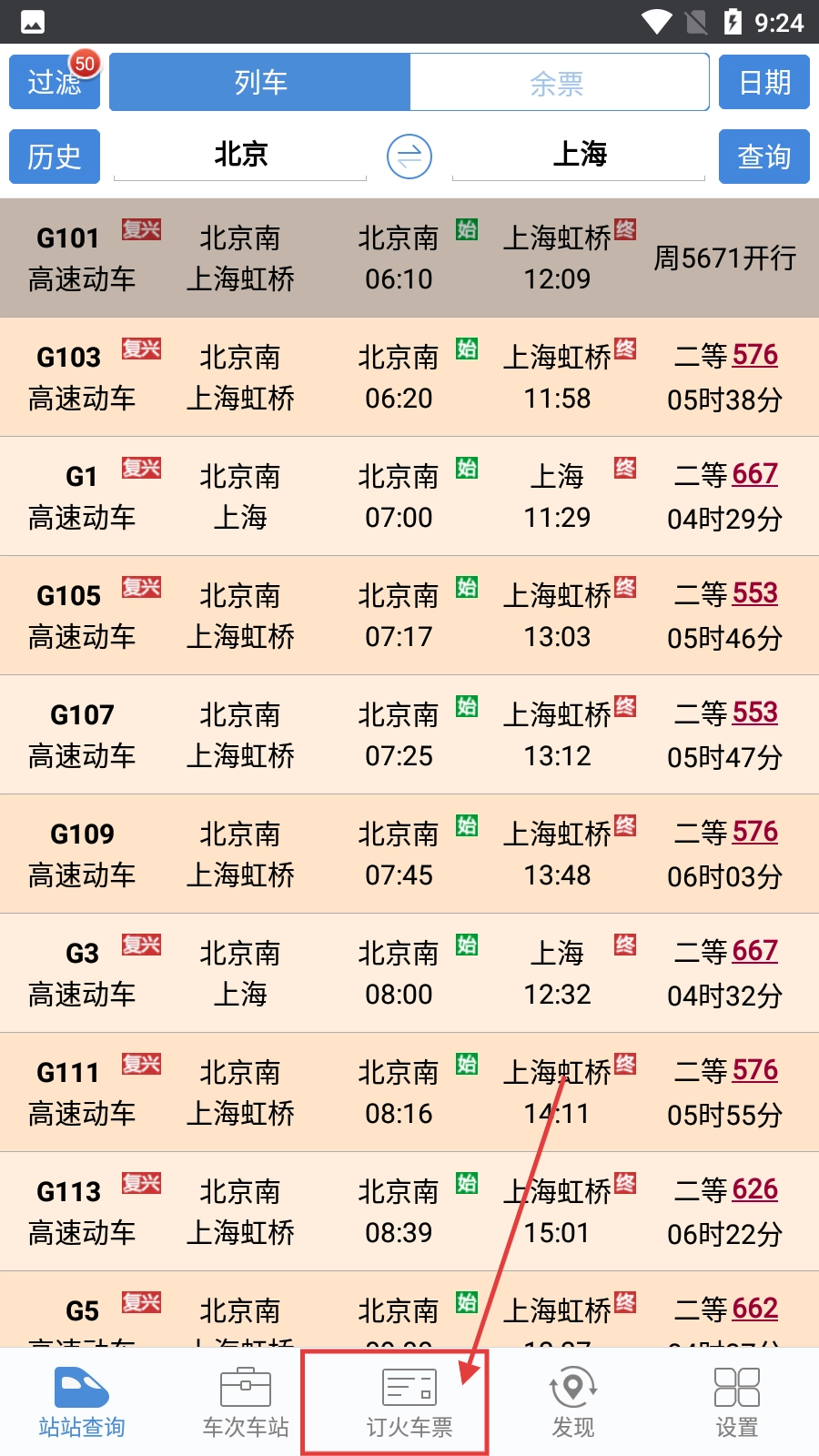 1、在列车查询界面,点击底部的【订火车票】按钮,即可进入订票相关页面。