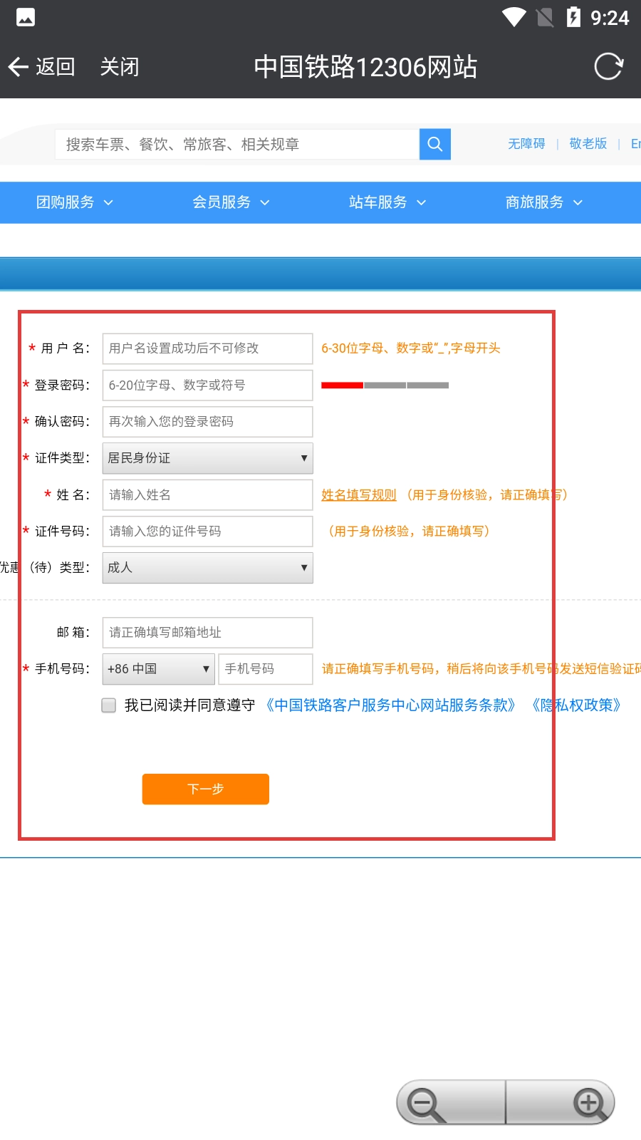 4、进入注册页面后,根据页面提示填写用户名、登录密码、证件信息等相关内容,即可完成注册流程。