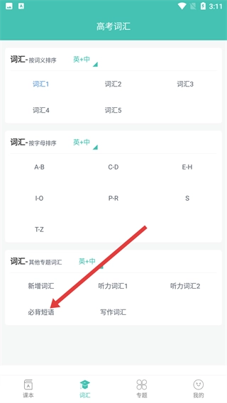 2、在词汇板块点击【必背短语】,进入必背短语列表页面后,能查看高考必背短语的各类分组,便于开展针对性学习。