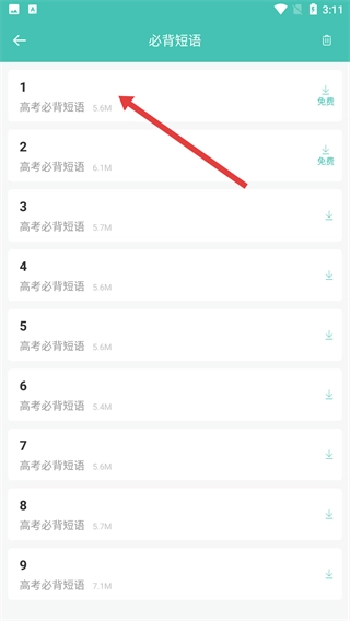 3、在“必背短语”列表里,点击【高考必背短语-5.6M】这一项,就能进入短语详情页面,查看具体的短语内容,帮助考生积累高考英语短语。