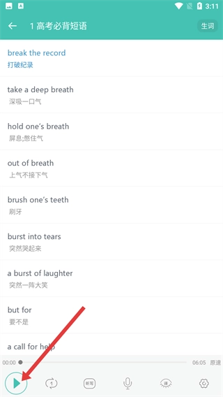 4、在短语详情页面,点击底部的播放按钮,就能收听短语音频,再结合【break-the-record-打破纪录】这类短语的中英释义,有助于提升英语短语的听记能力。