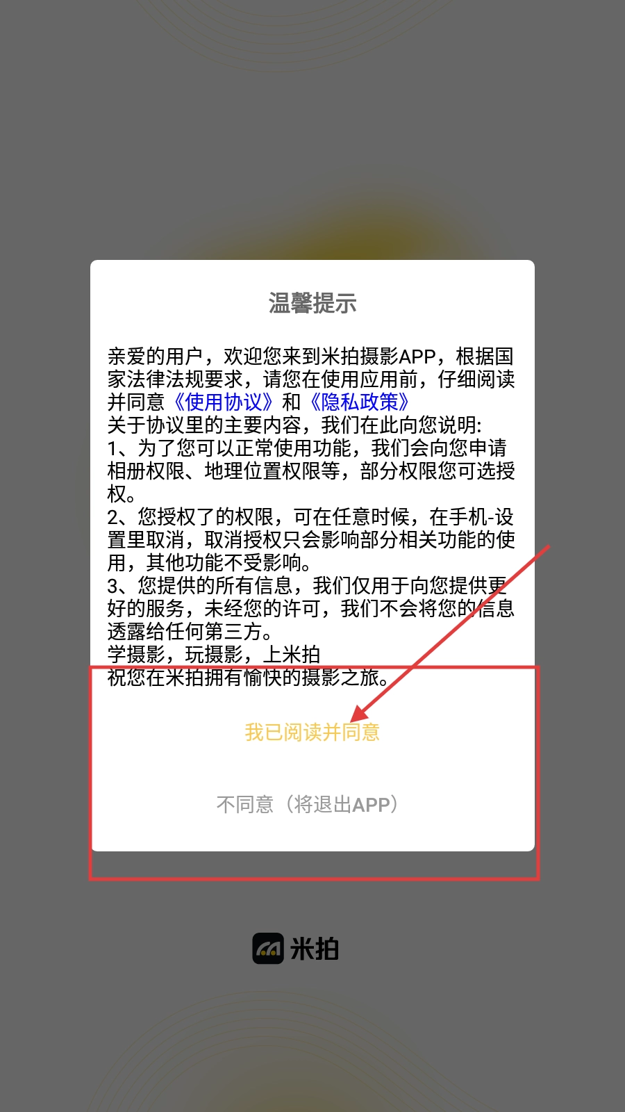 1、进入温馨提示界面后,点击【我已阅读并同意】按钮,以此确认同意《使用协议》与《隐私政策》。