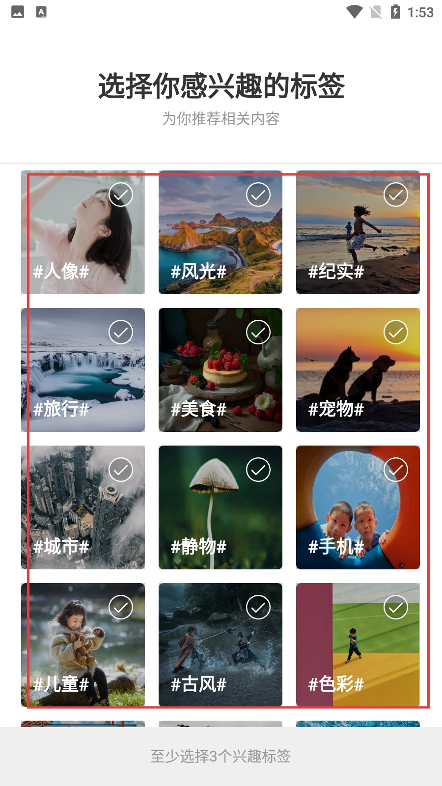 4、登录后,请选择至少3个感兴趣的摄影标签,这样系统就能为您推荐相关内容了。