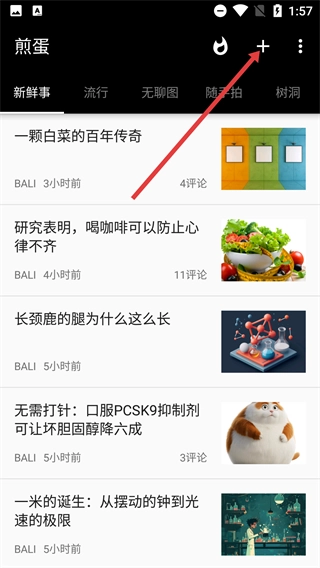 在煎蛋网站的首页,点击页面右上角的【+】号按钮,就能进入投稿界面。