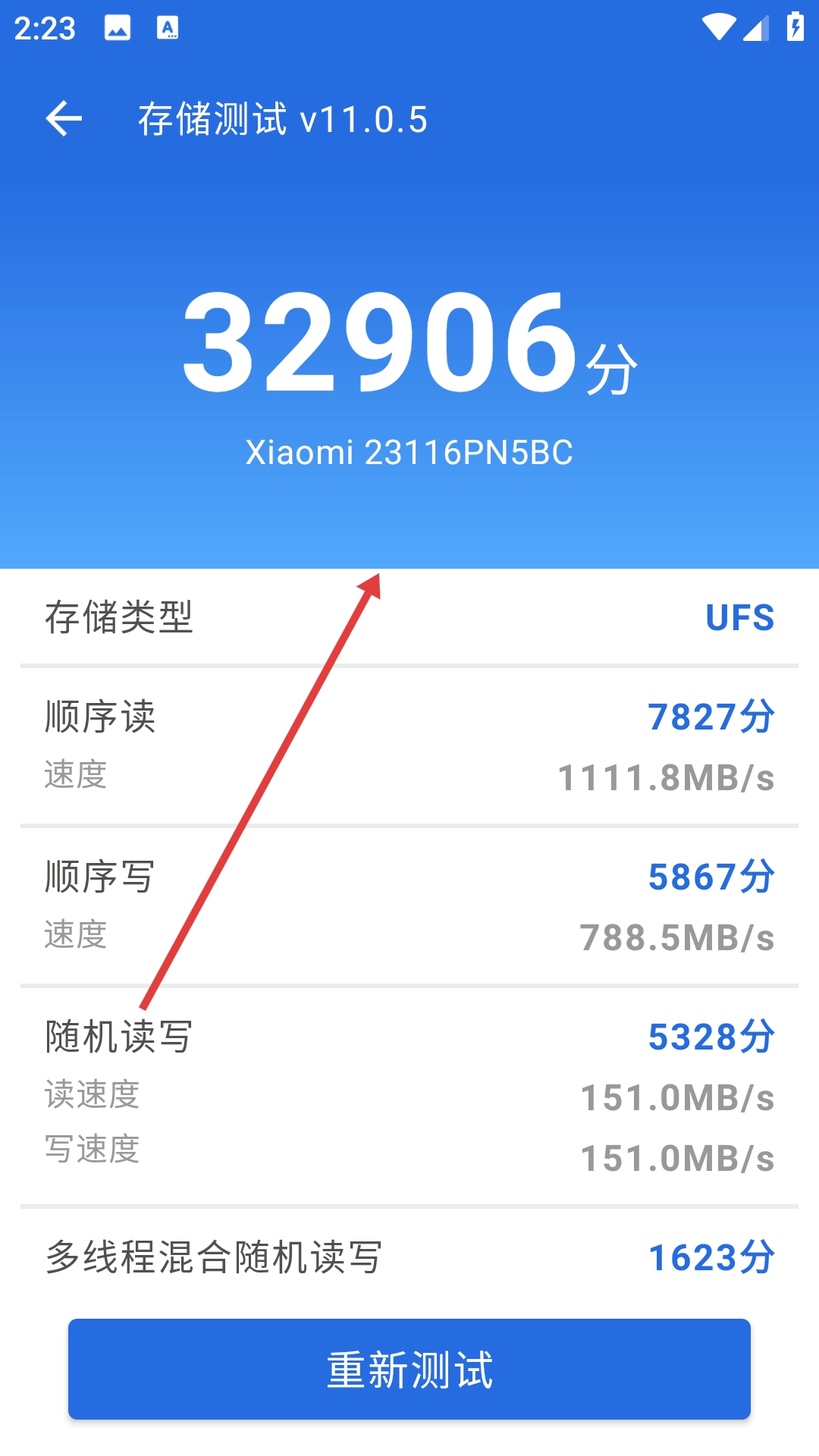 测试结束后,查看并存储测试得分以及各项性能数据,比如顺序读、顺序写的速度等。