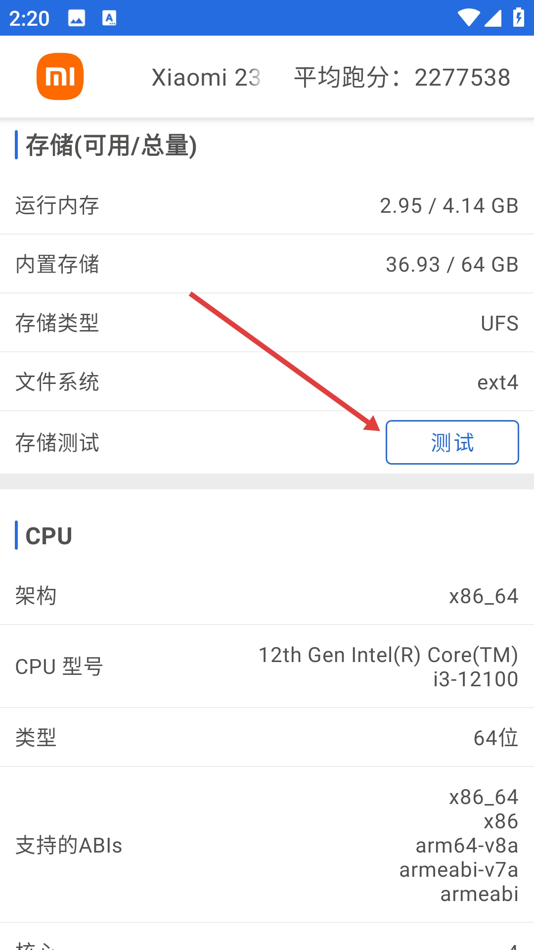 在设备信息页面找到【存储测试】选项,然后点击【测试】按钮。