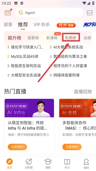 你可以在软件的首页找到【免费榜】这个标签,点击它就能查看免费课程的榜单了。
