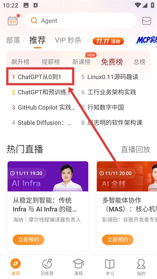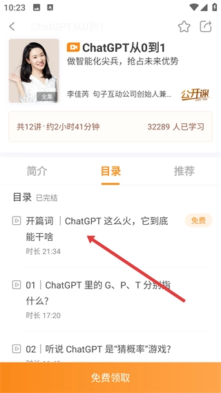 你可以在免费课程榜单里挑选自己感兴趣的课程,比如【ChatGPT从0到1】这门课。