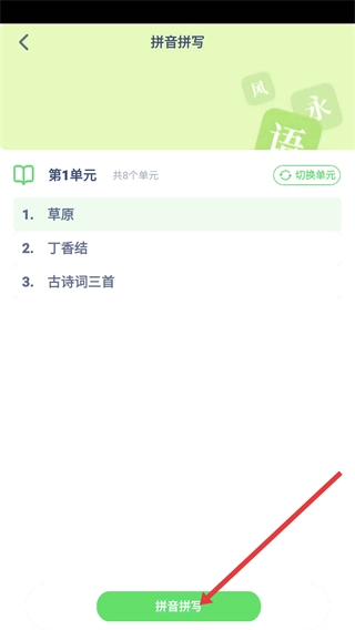在拼音拼写的单元页面,点击底部的【拼音拼写】按钮,即可进入题目练习环节。