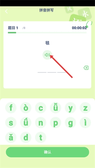 输入拼音后,点击【确认】按钮,即可完成这道题的拼音拼写练习。