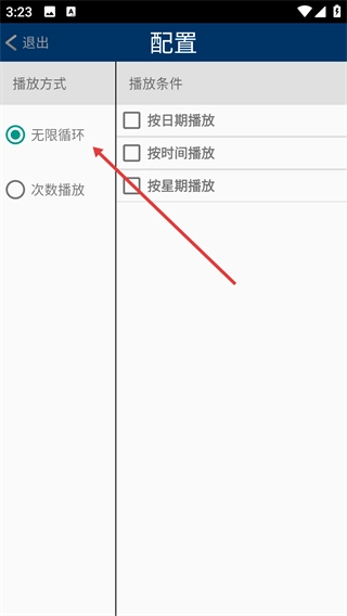 在配置界面的播放方式中选择【无限循环】。