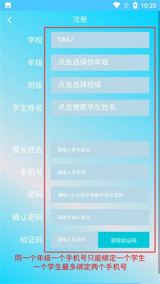 在注册页面,按照顺序填写学校、年级、班级、学生姓名、家长姓名、手机号码、密码、确认密码以及验证码,就能完成注册流程。