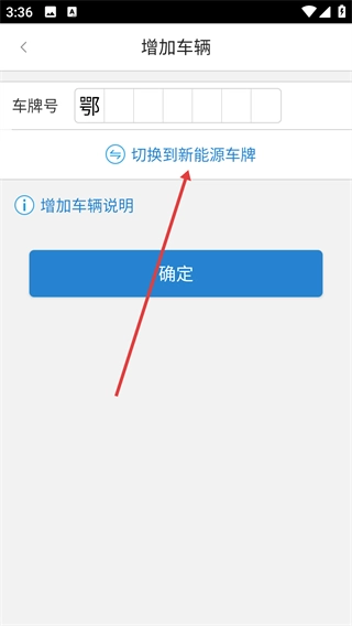 在添加车辆的界面中,点击【切换到新能源车牌】这个选项,就能完成车牌类型的切换操作。