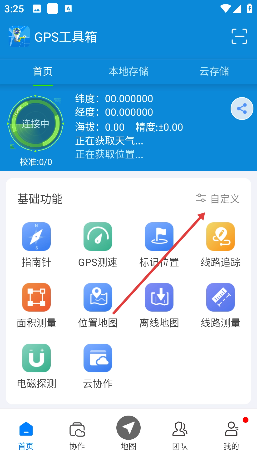 1、在GPS工具箱首页的基础功能区域点击【自定义】按钮,即可进入基础功能自定义界面。