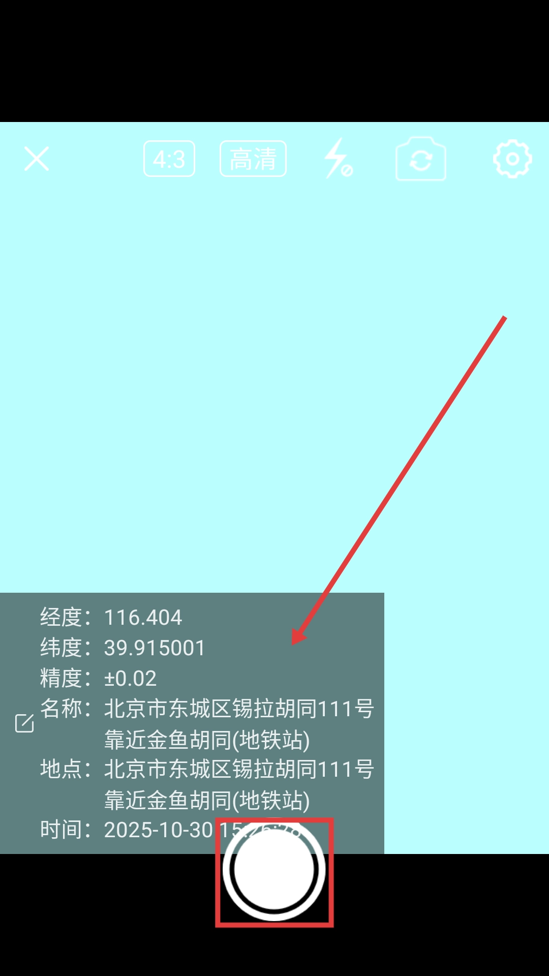 4、在经纬相机的界面中点击拍摄按钮,即可拍摄出包含经纬度、位置等信息的照片。