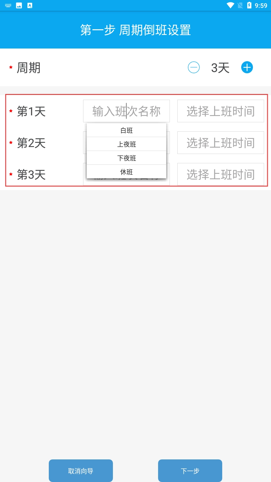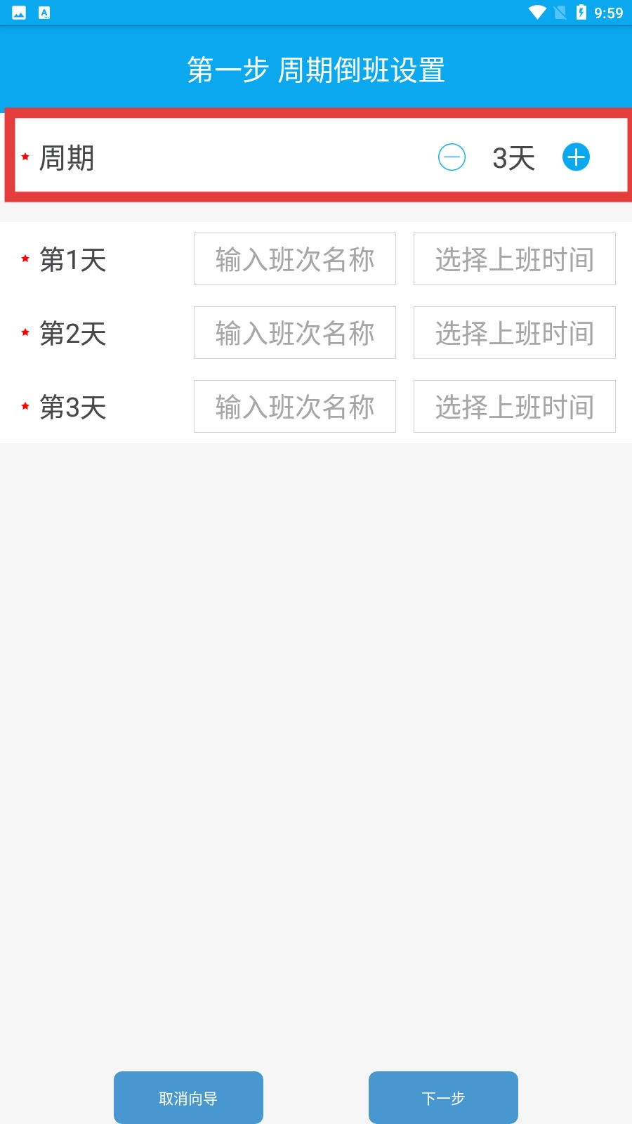 1、在周期倒班设置中,可通过加减按钮调整周期天数,例如当前显示为【3天-周期标识】。