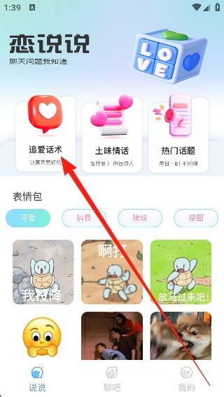1、打开【瓶子说】,点击【追爱话术】入口,进入恋爱聊天技巧获取界面。
