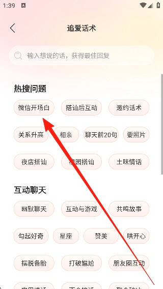 2、进入【追爱话术】页面后,选择【微信开场白】等热门搜索分类,以此来筛选合适的聊天策略。