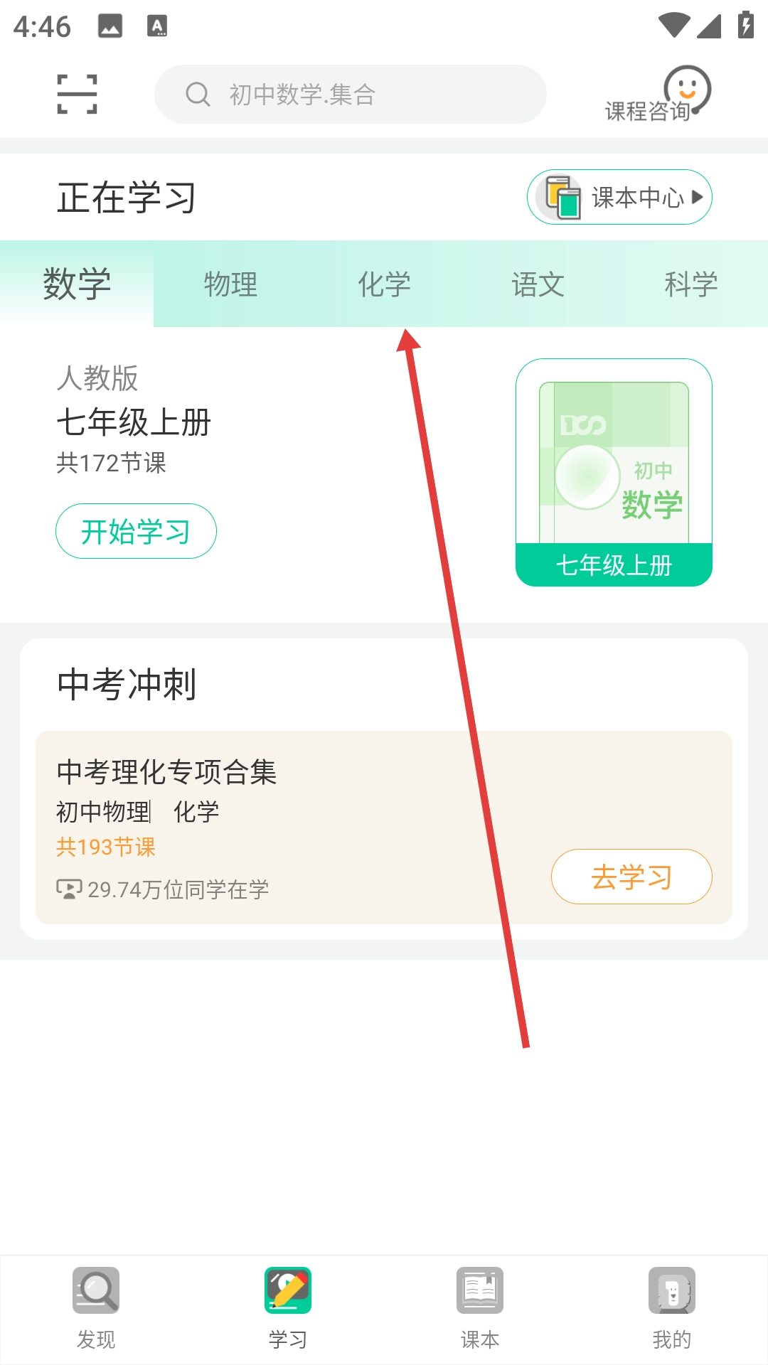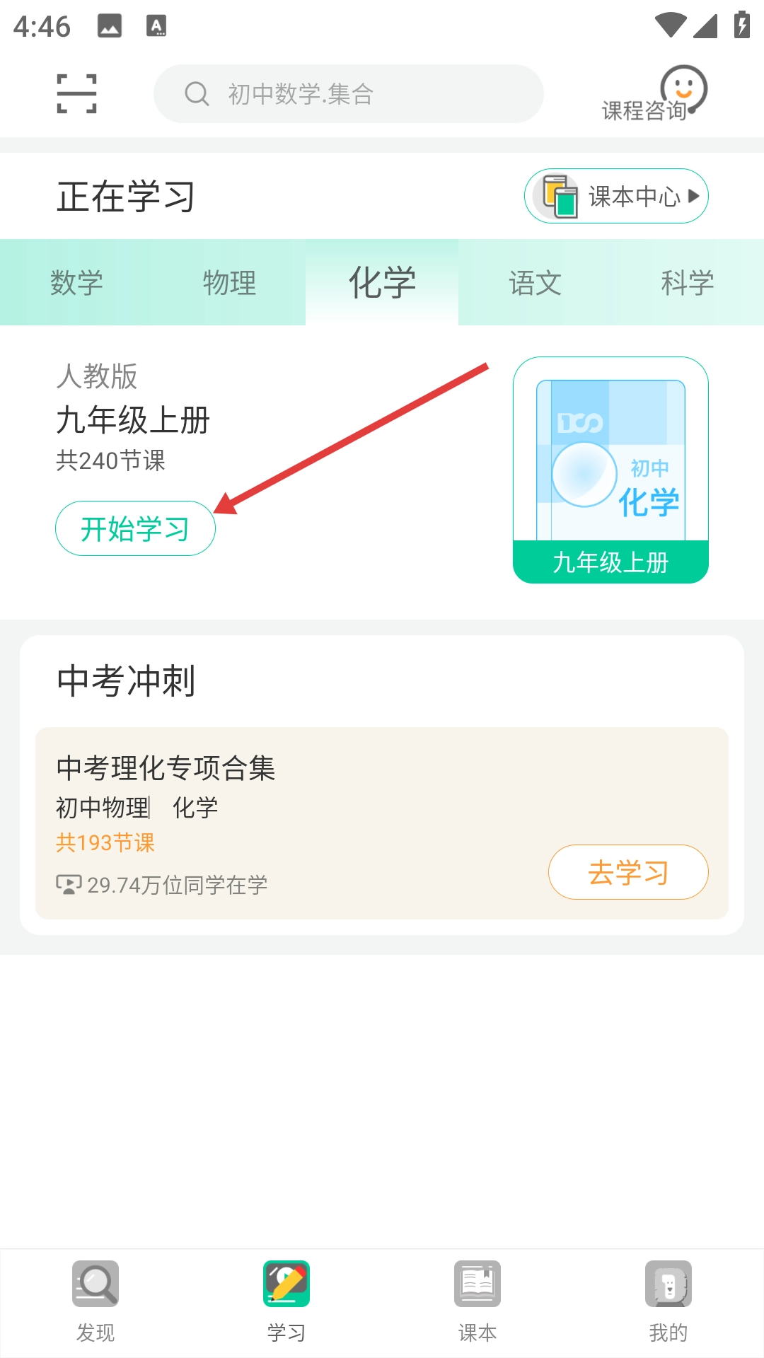 3、选择“九年级上册”的化学课程,然后点击“开始学习”按钮。