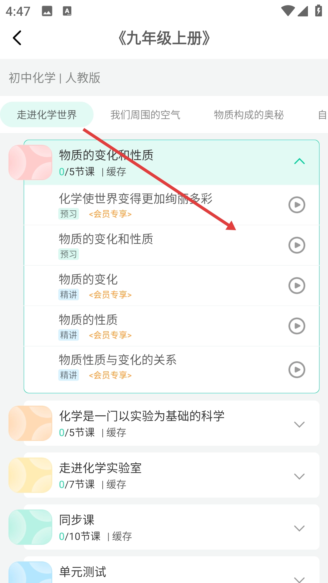 4、进入课程列表后,挑选具体的课程(例如“物质的变化和性质”),点击播放按钮即可开始学习。