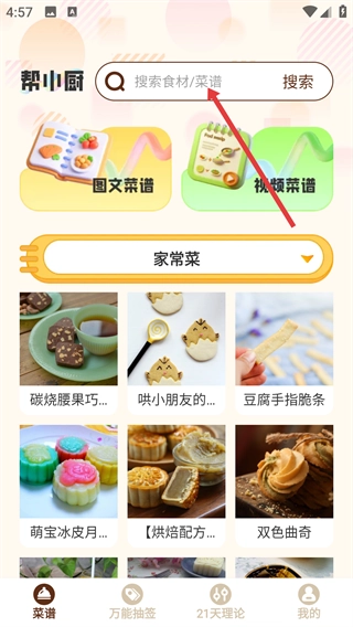 2、进入帮小厨主界面后,点击【搜索食材/菜谱】搜索栏,准备输入要查找的内容。