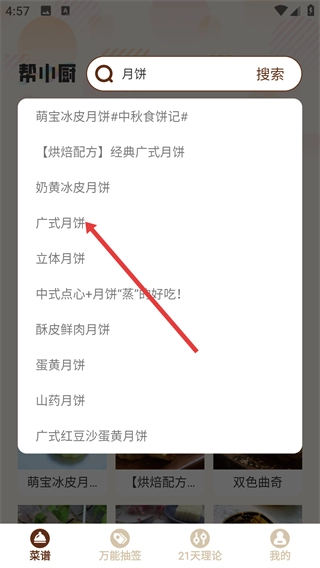3、在搜索框中输入【月饼】,接着点击搜索结果里的【广式月饼】,即可进入该菜谱的详情页面。