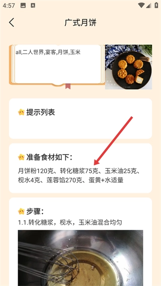 4、进入广式月饼详情页面后,能查看【准备食材如下】的列表和制作步骤,以此获取该菜谱的详细信息。