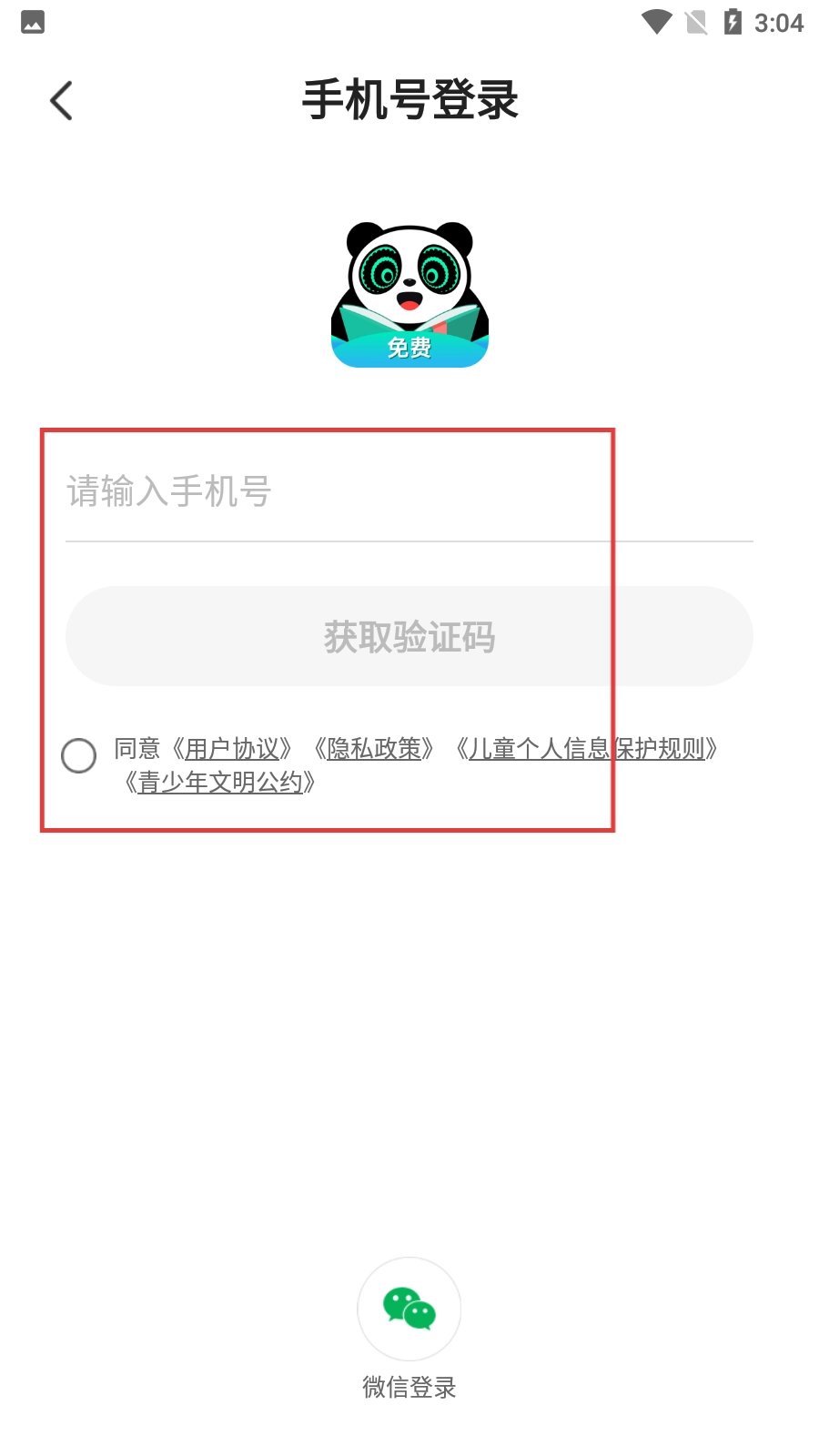 3、进入账号登录页面后,填写号码,点击【获取验证码】按钮,同时勾选同意相关协议。