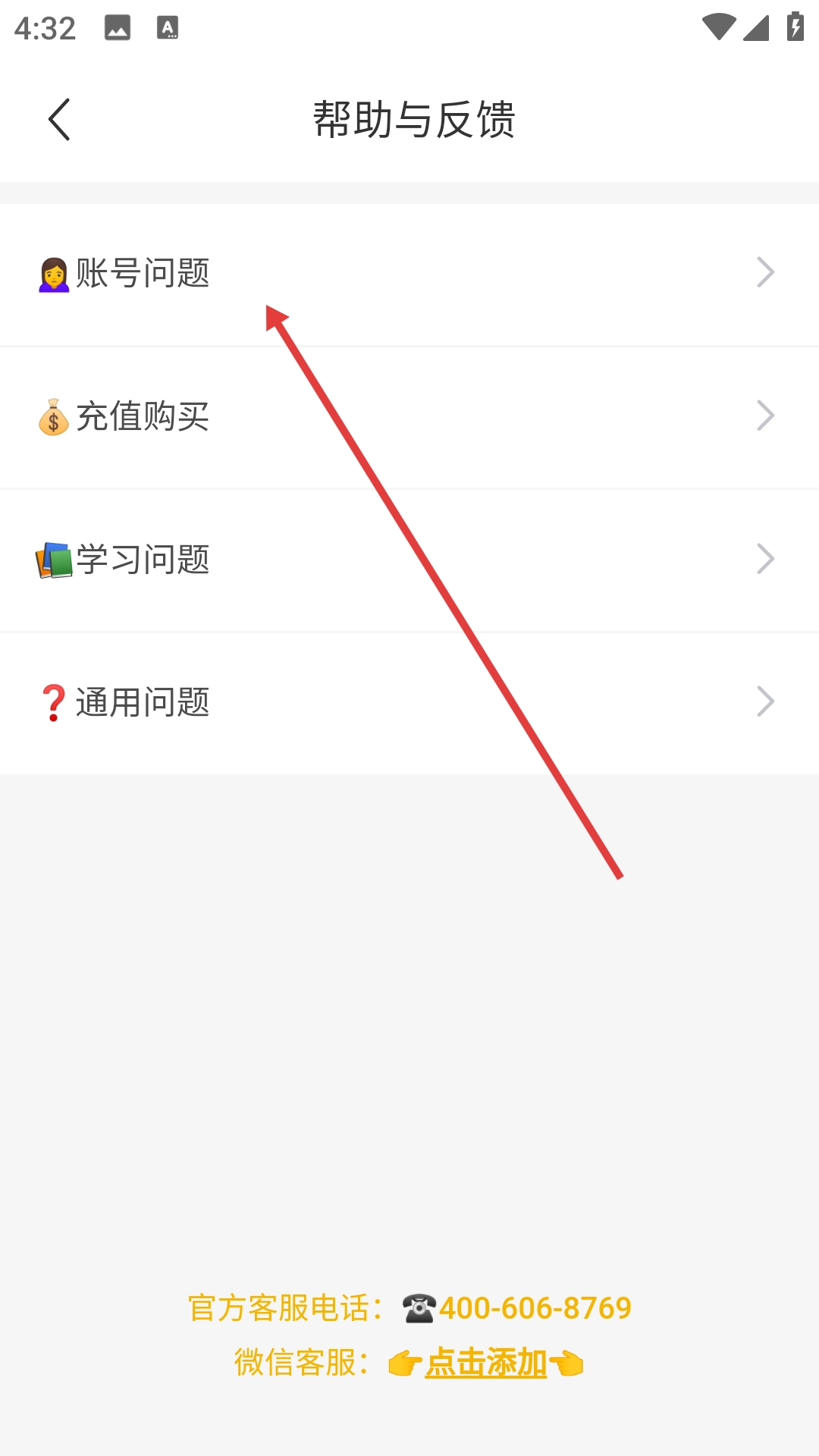2、在帮助与反馈界面选择【账号问题】选项,即可进入账号问题的分类页面。
