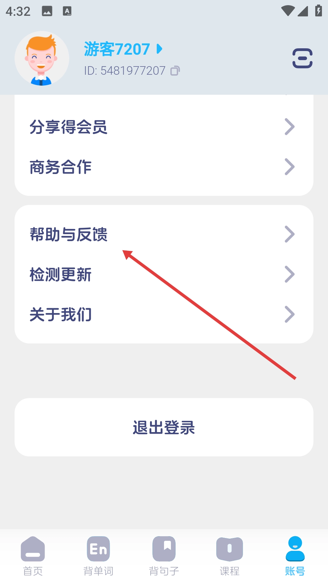 1、在账号页面找到并点击【帮助与反馈】选项,即可进入帮助与反馈界面。