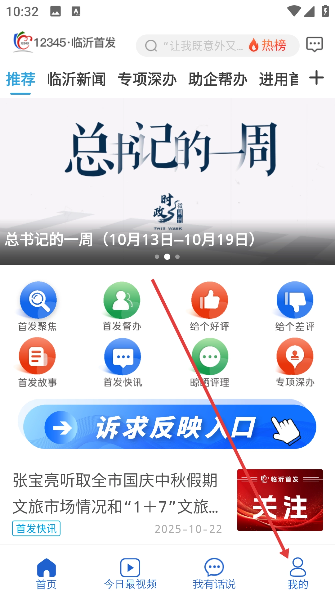 1、在“12345·临沂首发”首页找到并点击【我的】按钮,即可进入个人页面。